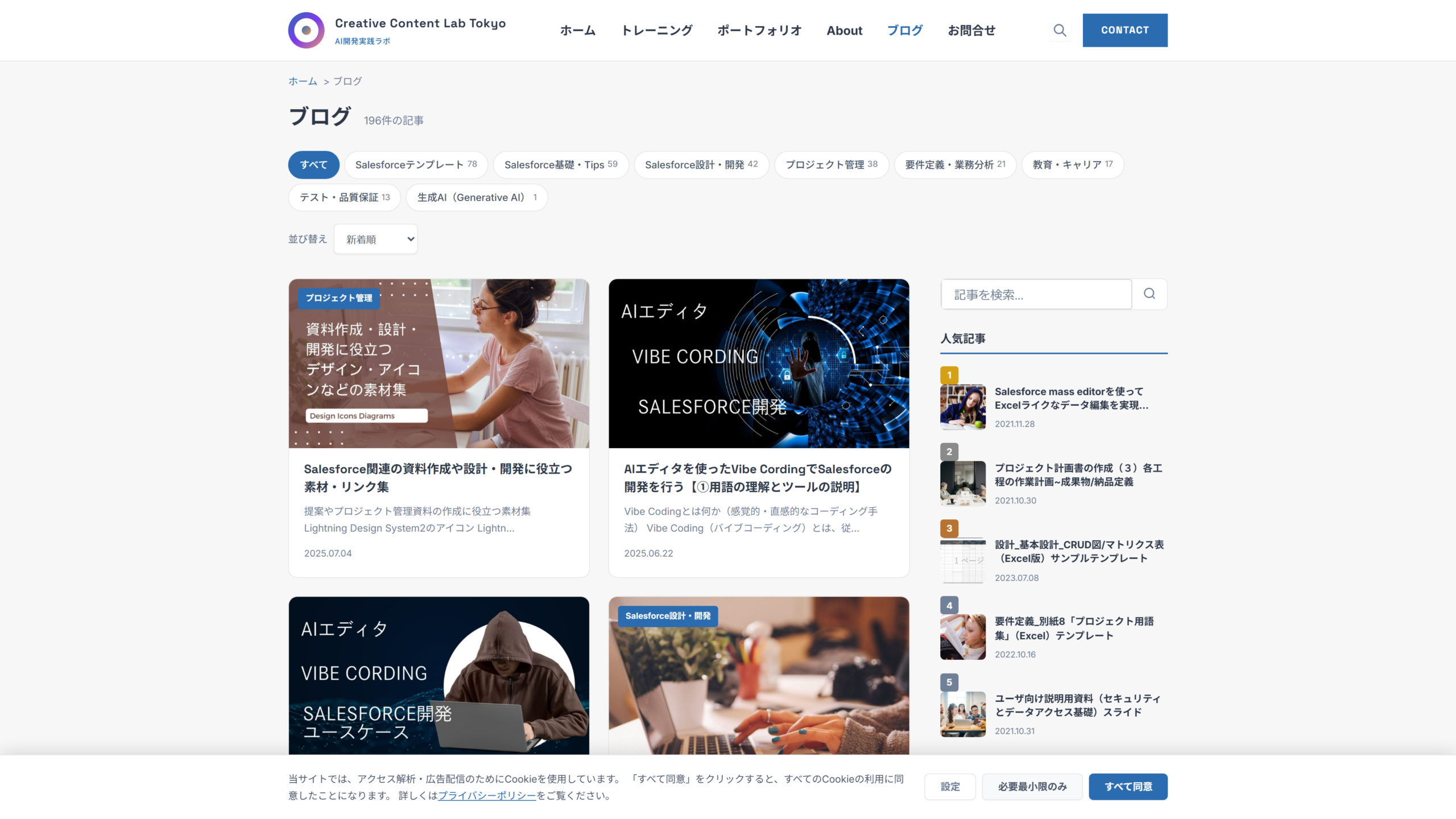 カテゴリフィルター、サイドバー(人気記事・おすすめ記事)、目次自動生成、関連記事。