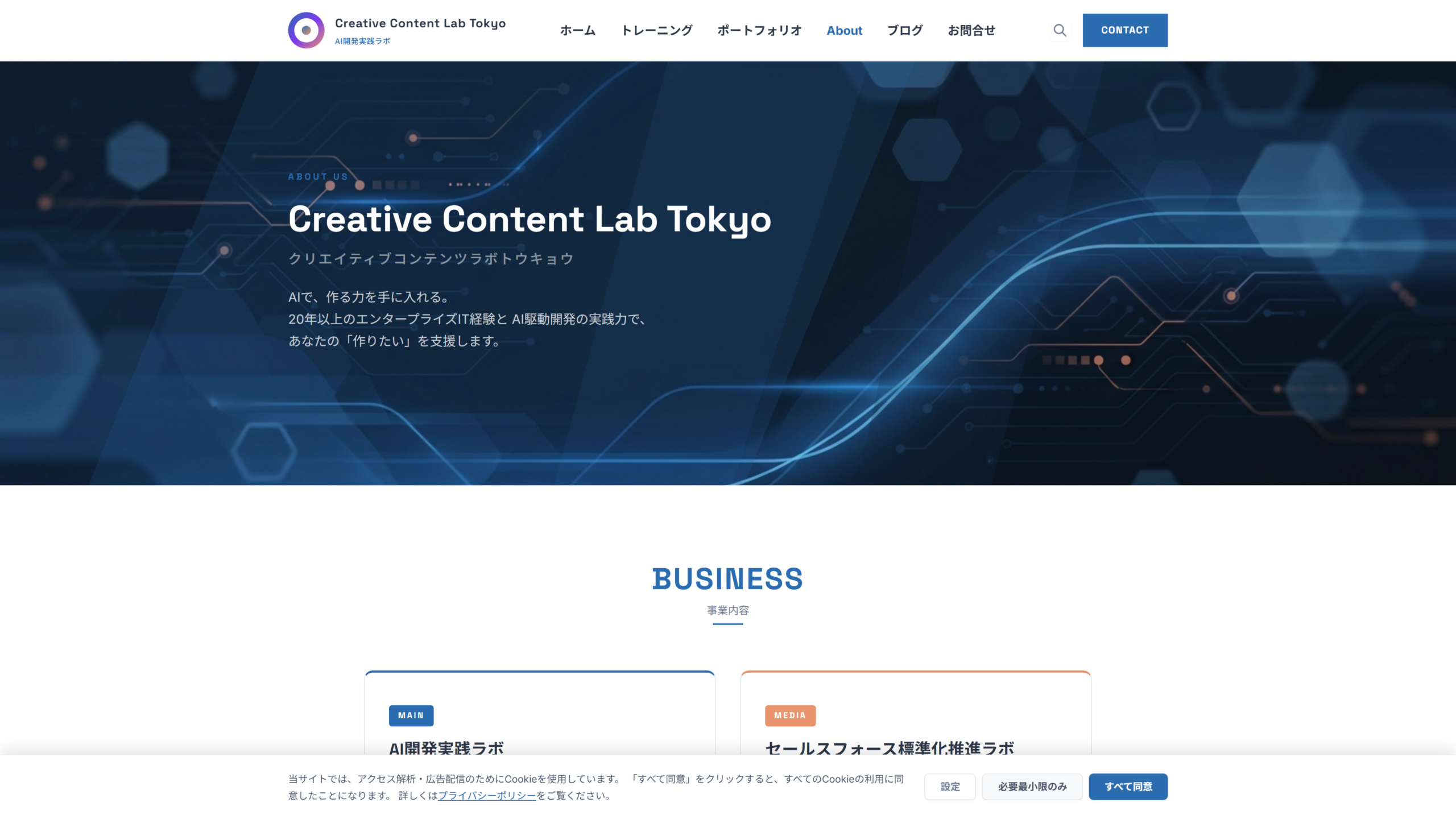 - カスタムテーマのフルスクラッチ開発 — Astra子テーマをベースに、トップ・About・ポートフォリオ・ブログ・トレーニング・お問い合わせ等の全ページを独自設計