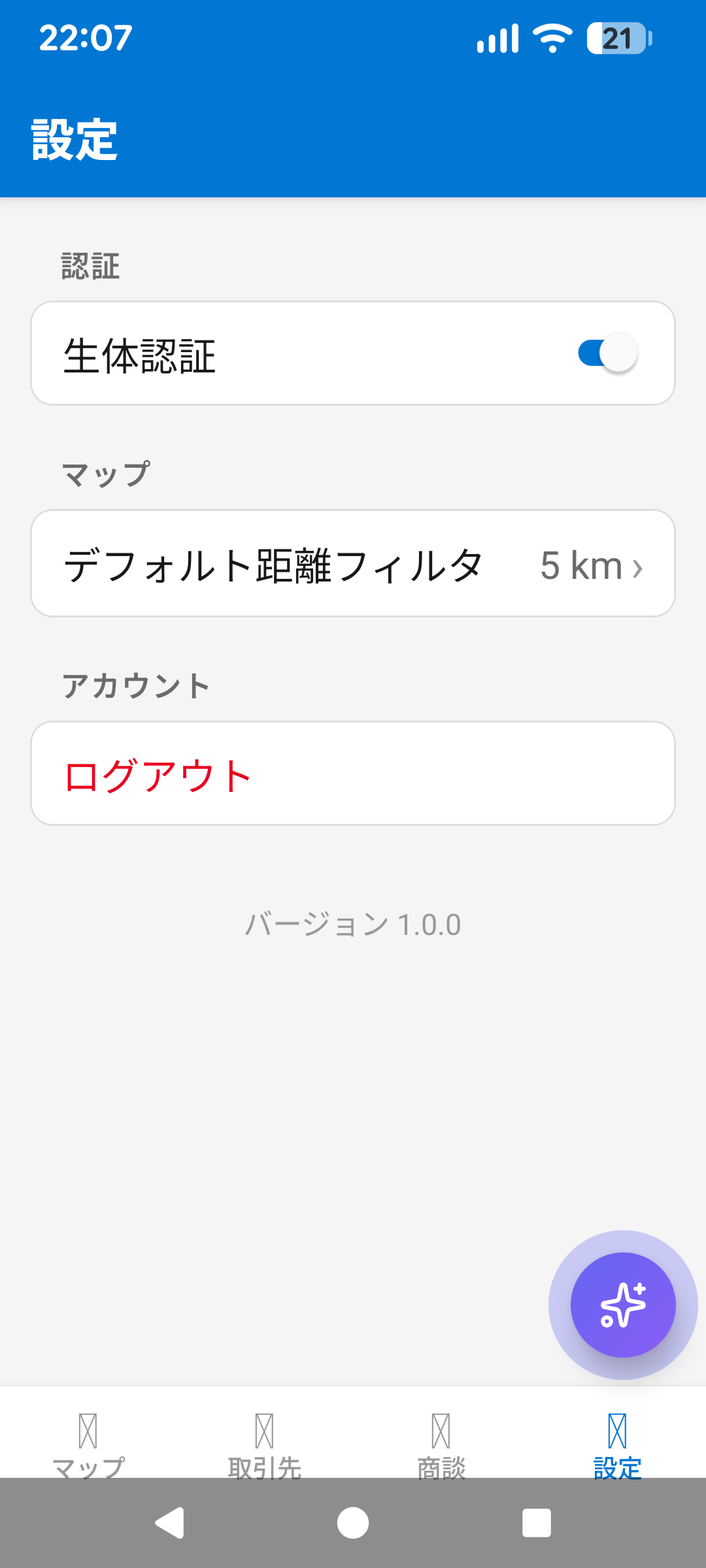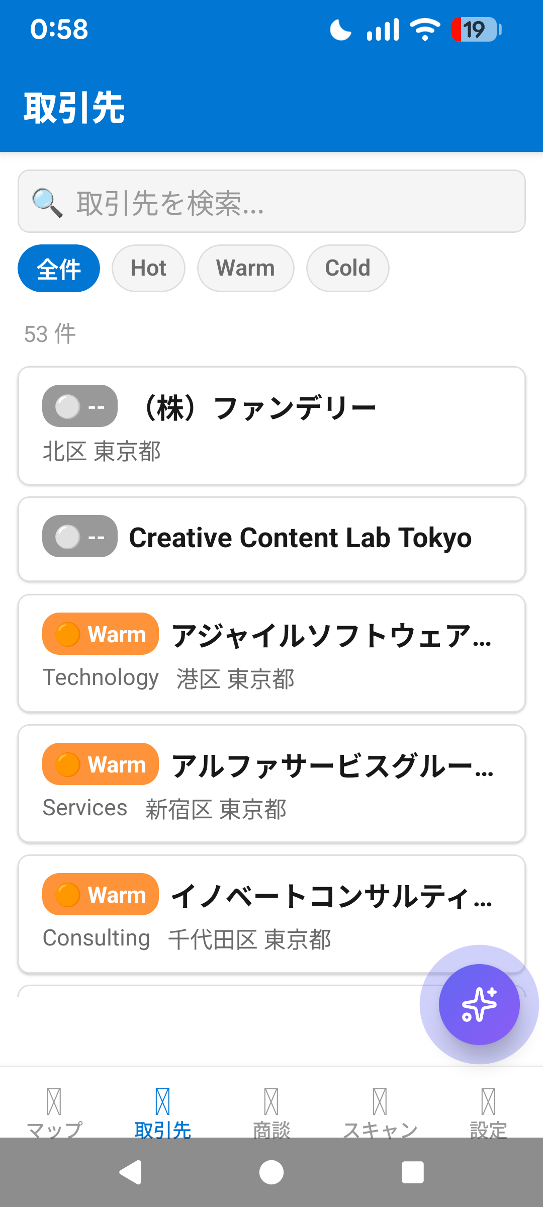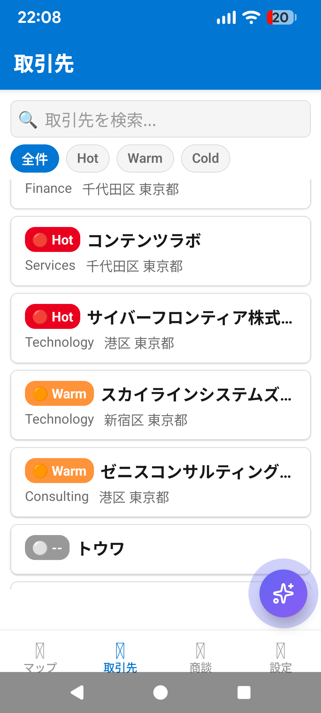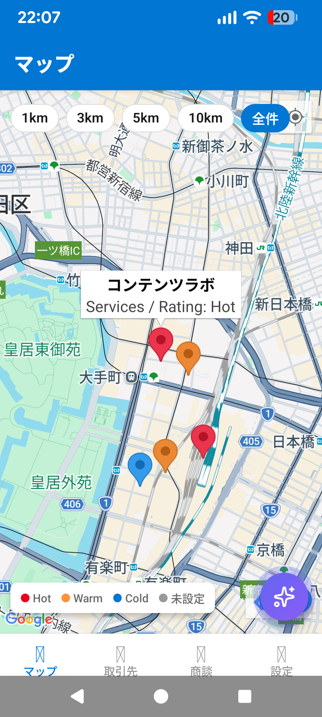 現在地周辺の取引先をピン表示。距離フィルタとRating色分けで重要顧客を即座に把握。