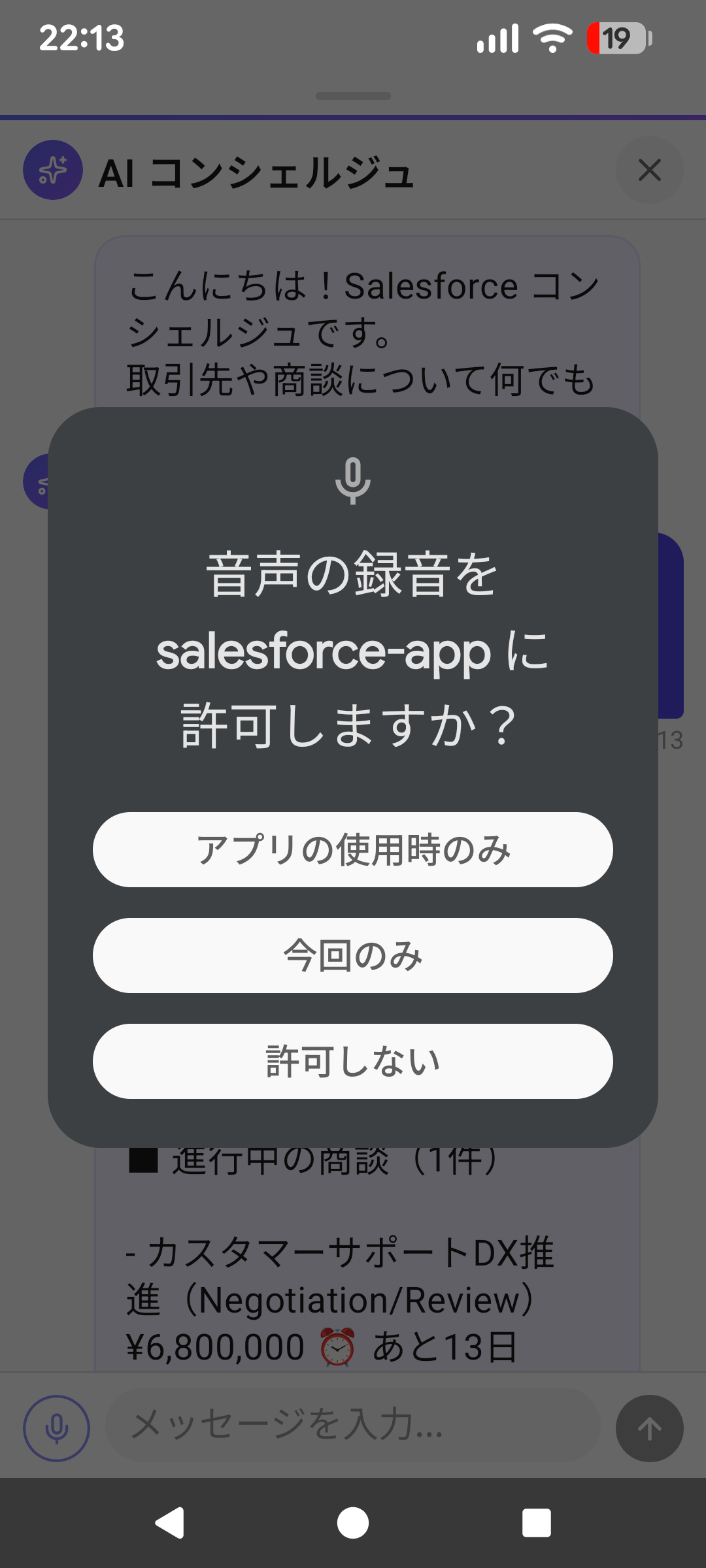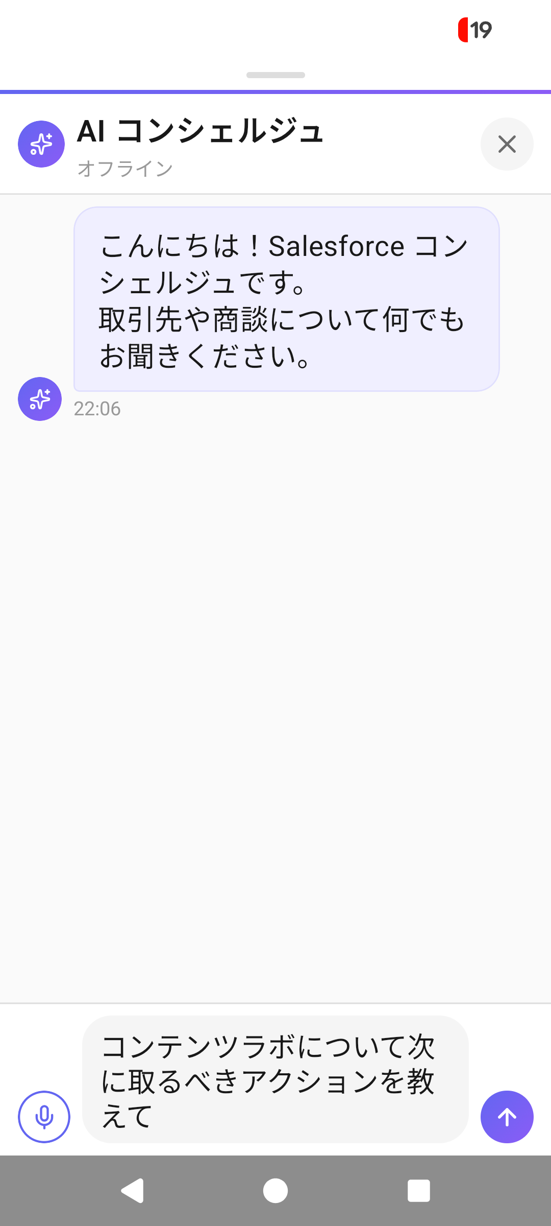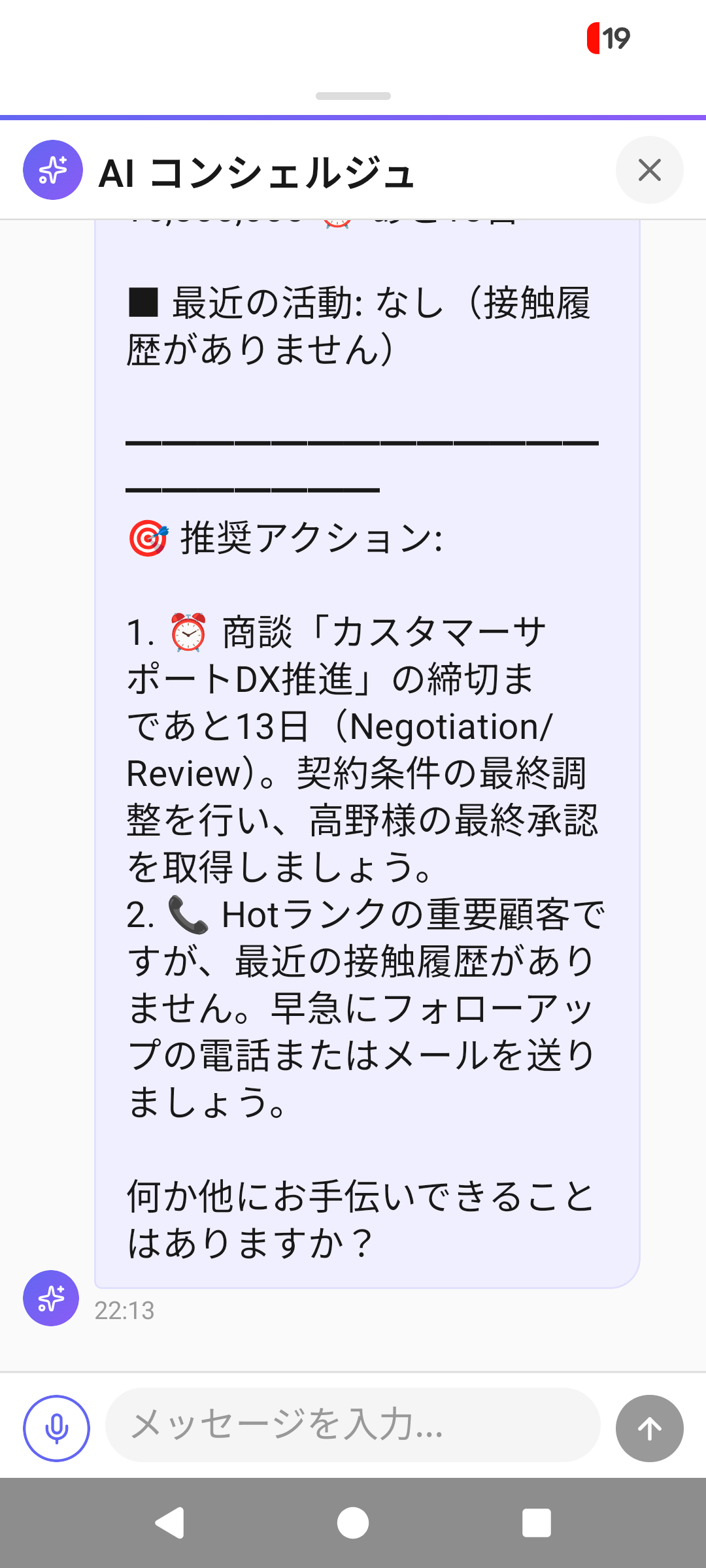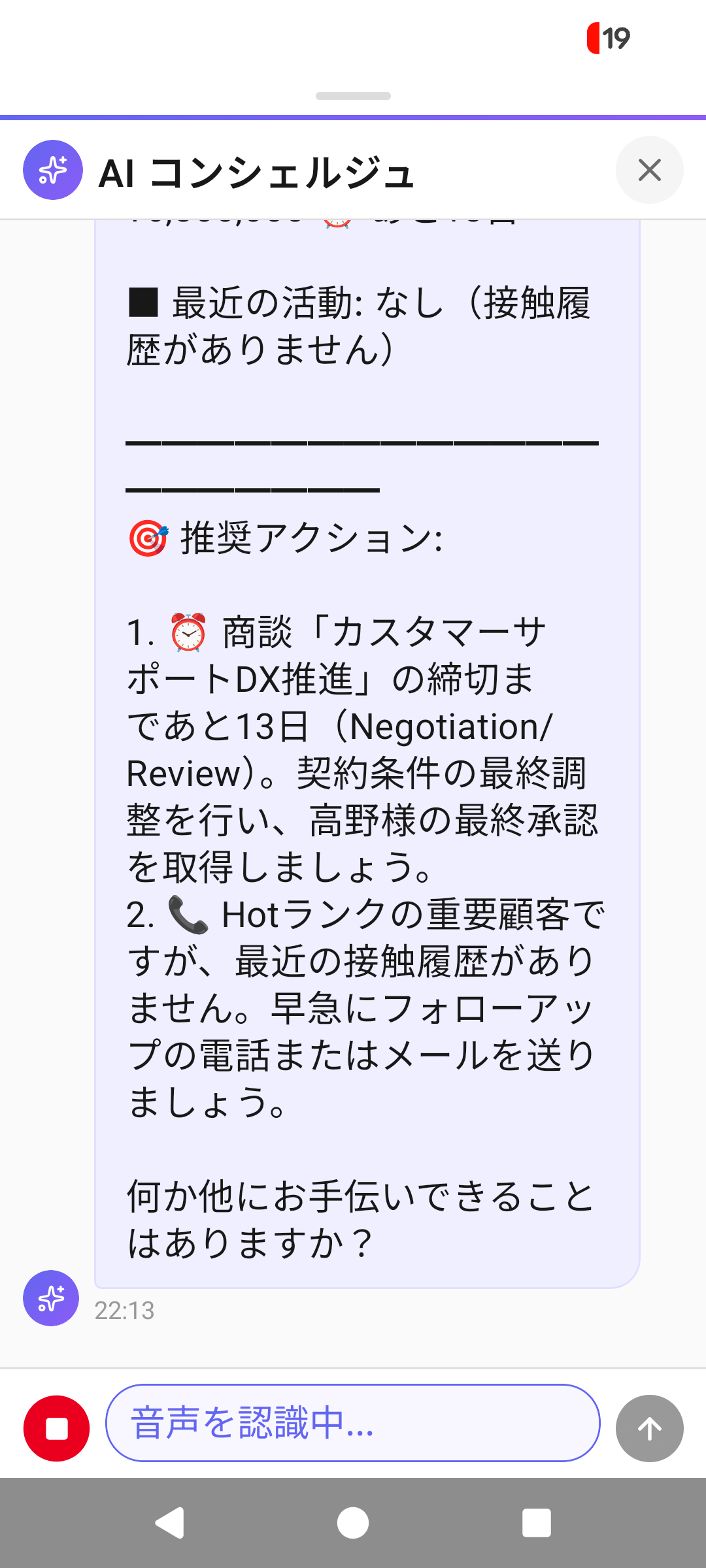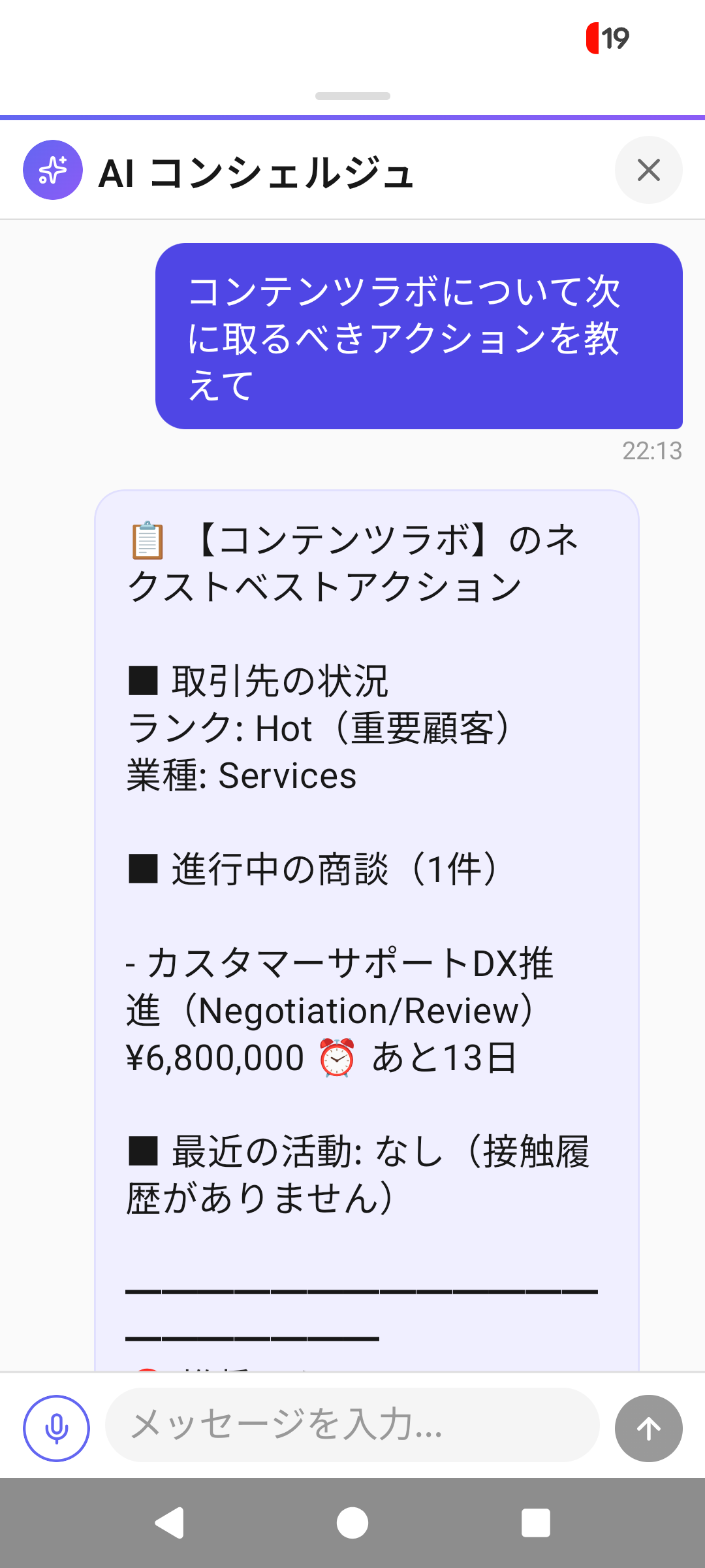 チャットUIで取引先のネクストベストアクションをAIが提案。音声入力にも対応。
