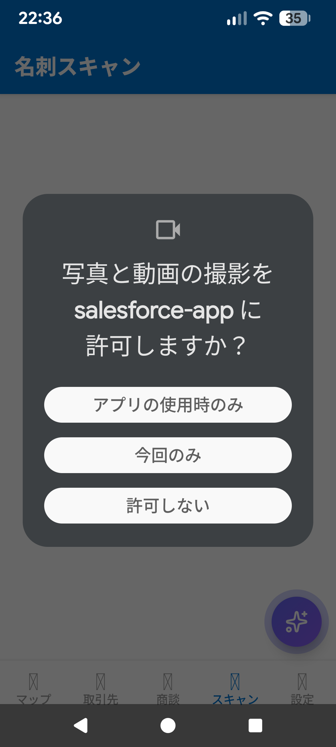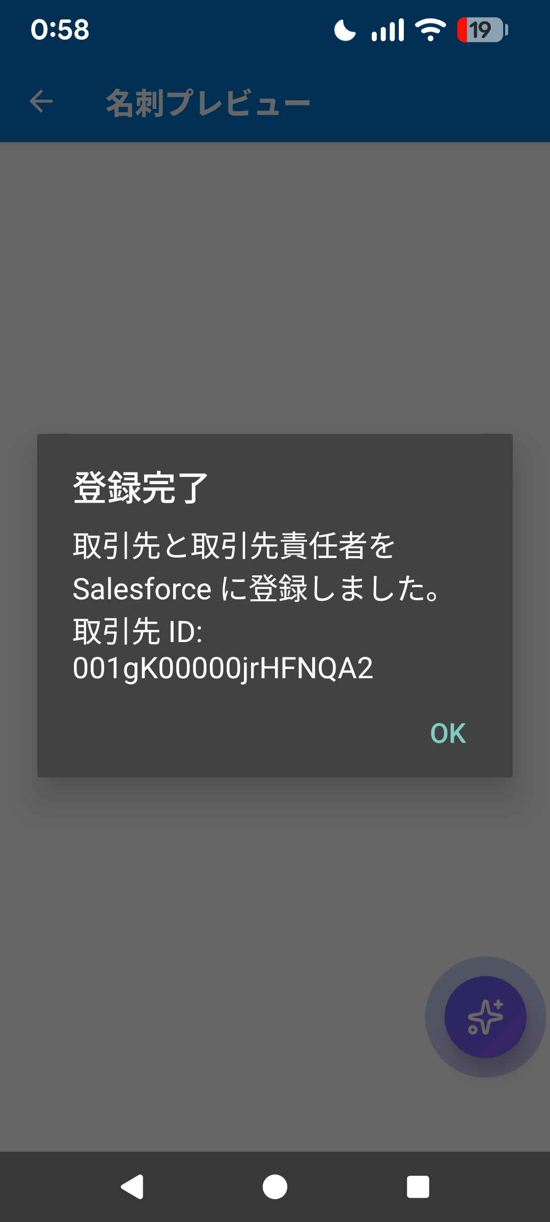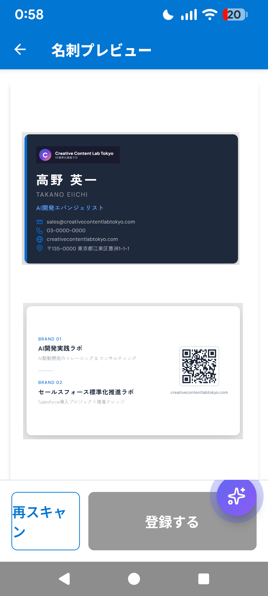 カメラまたはファイル選択でAI-OCR読取。取引先・取引先責任者としてSalesforceに自動登録。