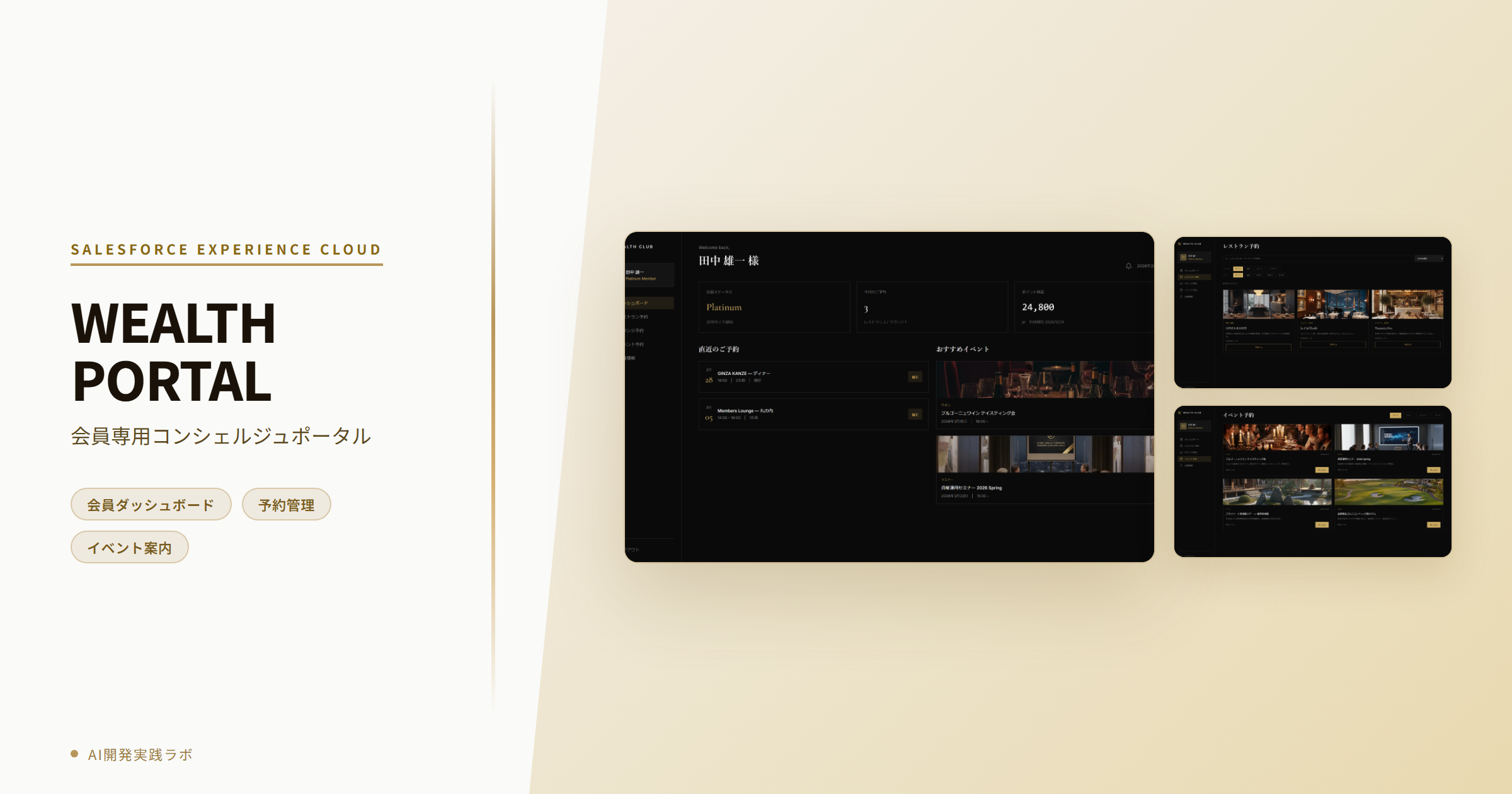 Next.js/Vercelで構築したWEALTH CLUBのWebアプリケーションを、Salesforce Experience Cloud上にLightning Web Components(LWC)を使って再構築したプロジェクトです。Salesforceプラットフォームの堅牢なセキュリティとデータ管理機能を活かしながら、元のデザインと同等のUI/UXを実現しています。