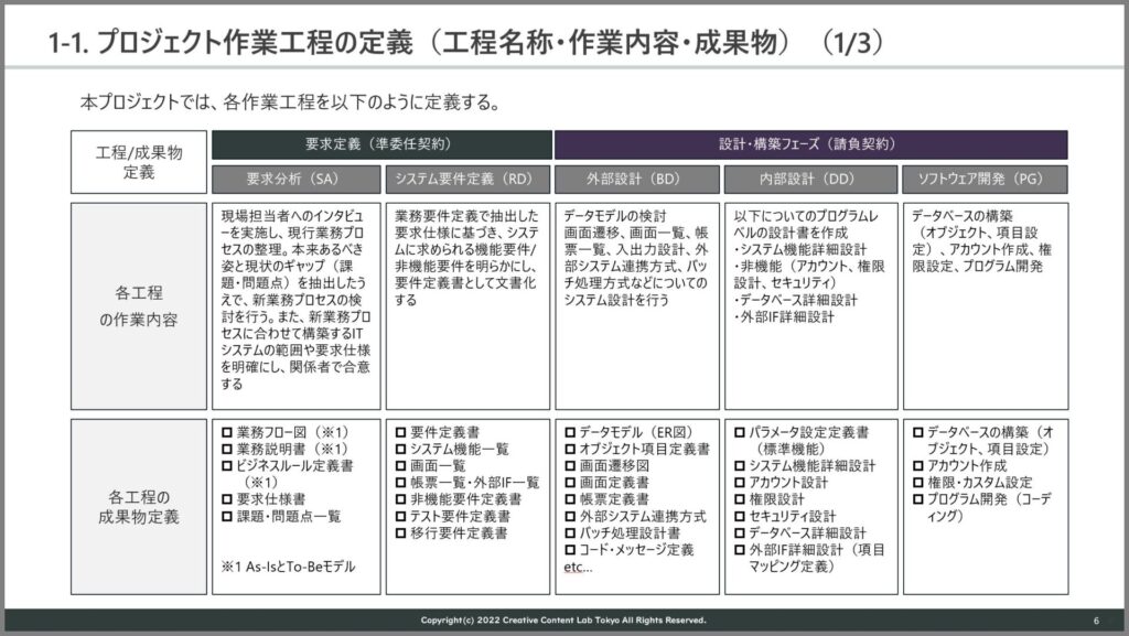 1.プロジェクト作業工程の定義(工程名称、作業内容、成果物)